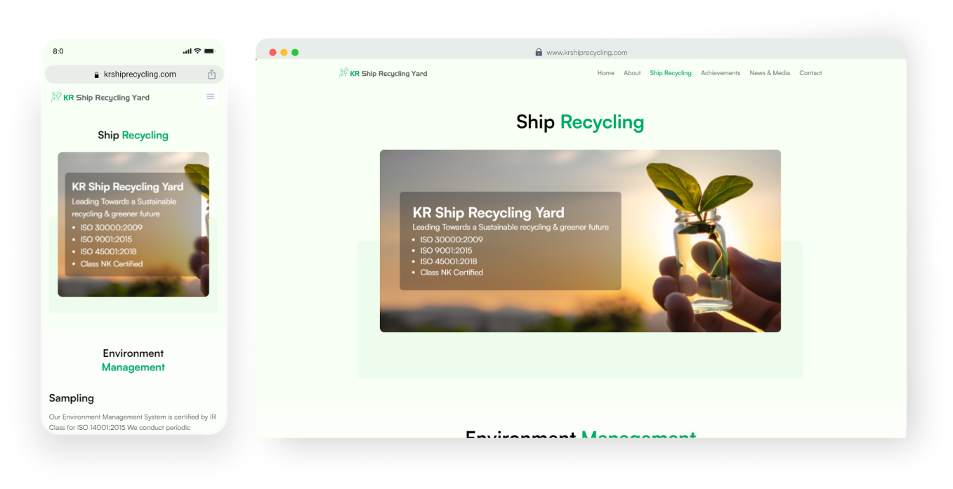 The KR Ship Recycling Yard website project was envisioned as an initiative aimed at developing a website that aligns with the company's refreshed brand identity centered around sustainability, encapsulated by the "Going green" ethos. The primary objective was to design a platform that not only reflects this commitment but also effectively showcases the company's overview along with its notable achievements.